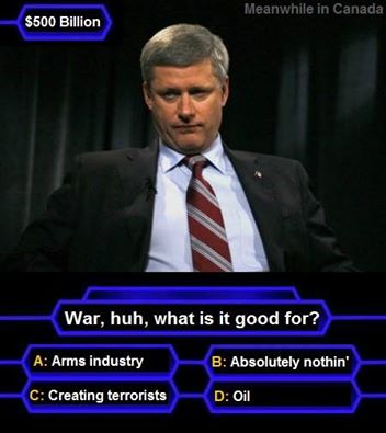 And then there are the "real" wars. Syria, Libya, Iraq....we're just waiting for someone to start a war with Iran, and language is getting tense with Russia. After WWI, WWI, Korea, Vietnam, Iraq.... you would have thought we'd have learned something. Huh.
